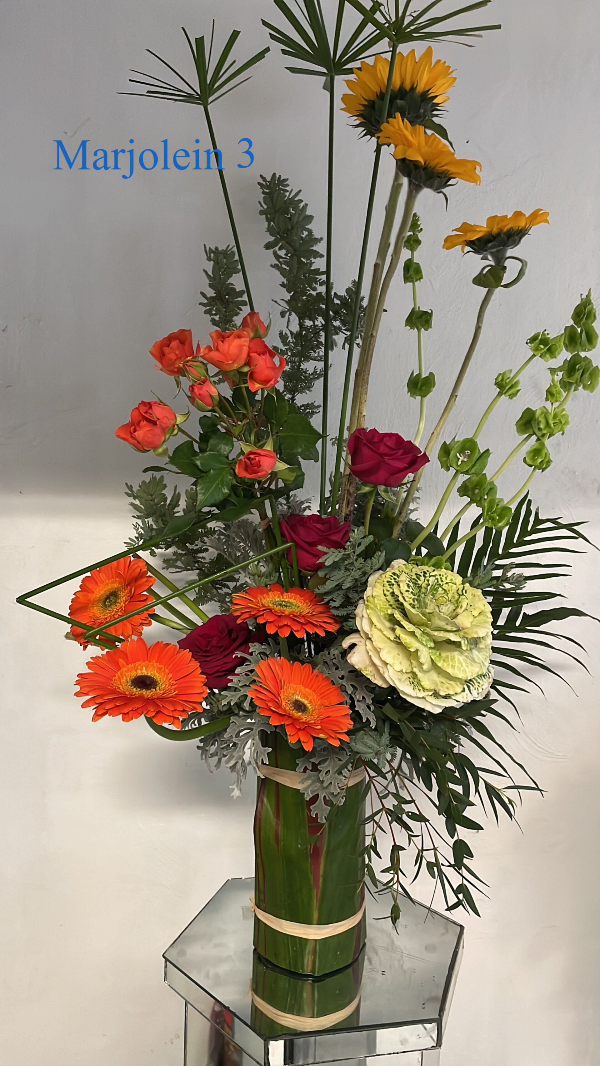 Marjolein 3, Base forrada, gerbera, mini rosa, girasol, repollo.