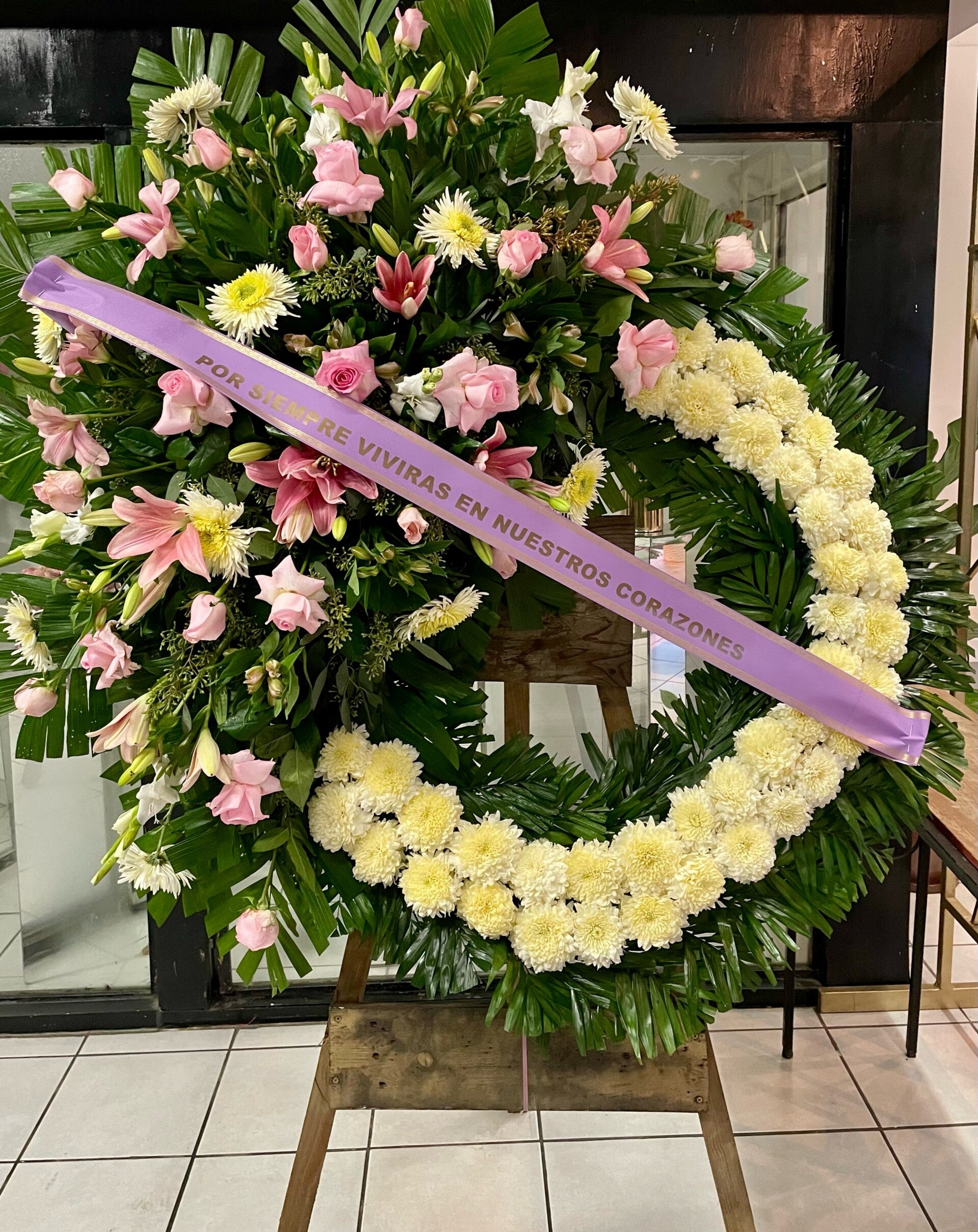 Corona con arreglo doble. rosas, pompon, lilis, perrito hortencias.